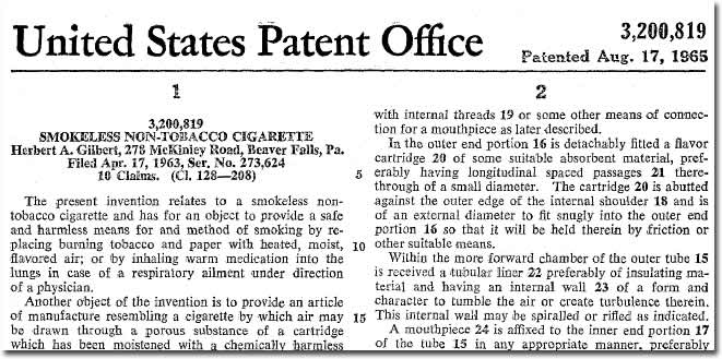 Еще в далеком 1963 году, Герберт А. Гилберт (Herbert A. Gilbert) подал на регистрацию своего патента для бездымной и не содержащей табака сигареты. Спустя два года, его патент на первую электронную сигарету (e-cigarettes) наконец-то был принят.